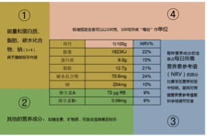“营养成分表”是营养标签的核心内容。其中能量和蛋白质、脂肪、碳水化合物、钠的含量为强制标示的内容,又称“1+4”。其他成分如钙、铁、维生素等信息,由生产企业自愿标示。